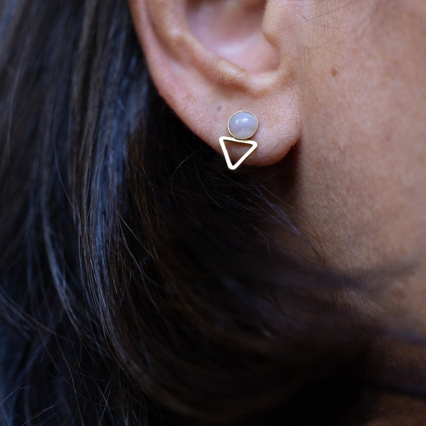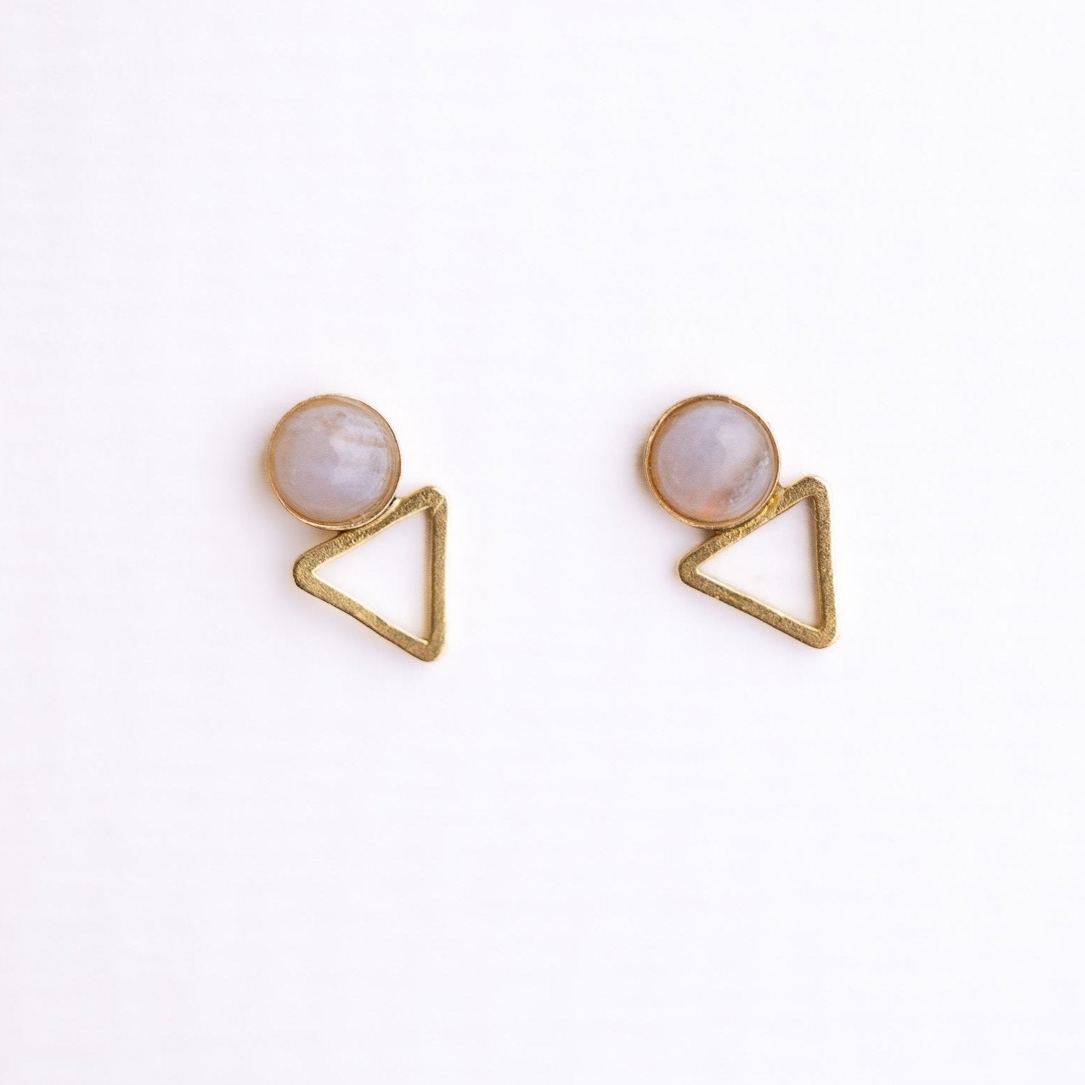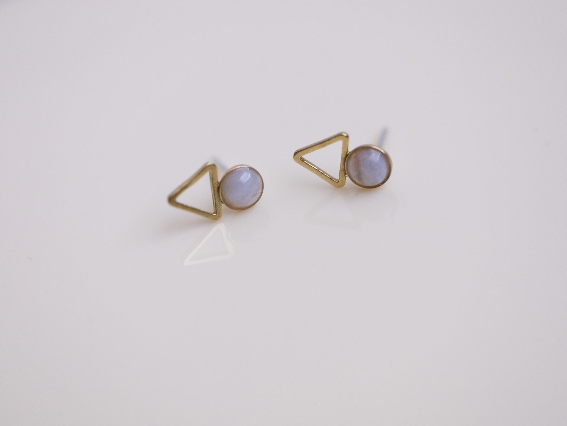 Elevate your everyday look with these chic, geometric earrings. Featuring a Blue Lace Agate cabochon set in a brass bezel and paired with a delicate open triangle, these studs add a touch of elegance and modern design to any outfit. Plus, Blue Lace Agate is known for its calming qualities, allowing you to KEEP CALM and CARRY ON! A versatile favorite, you’ll be reaching for them again and again.