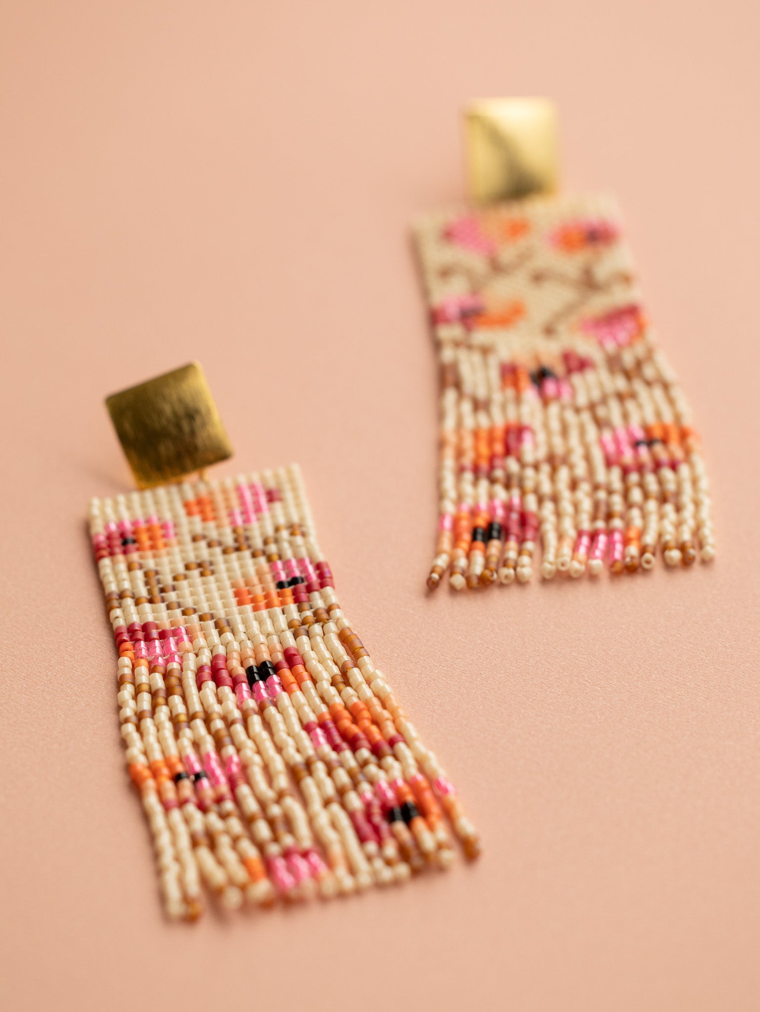 Elevate any look with these luxurious Falling Flower Fringe earrings! Hand-woven with premium Japanese Miyuki glass beads, this design gracefully blends an intricately woven upper section that flows seamlessly into delicate hand-strung fringe—resembling little falling flowers—for a truly sophisticated touch. Hung from brushed gold fill squares with surgical steel posts. So go ahead, dazzle with every turn of your head!