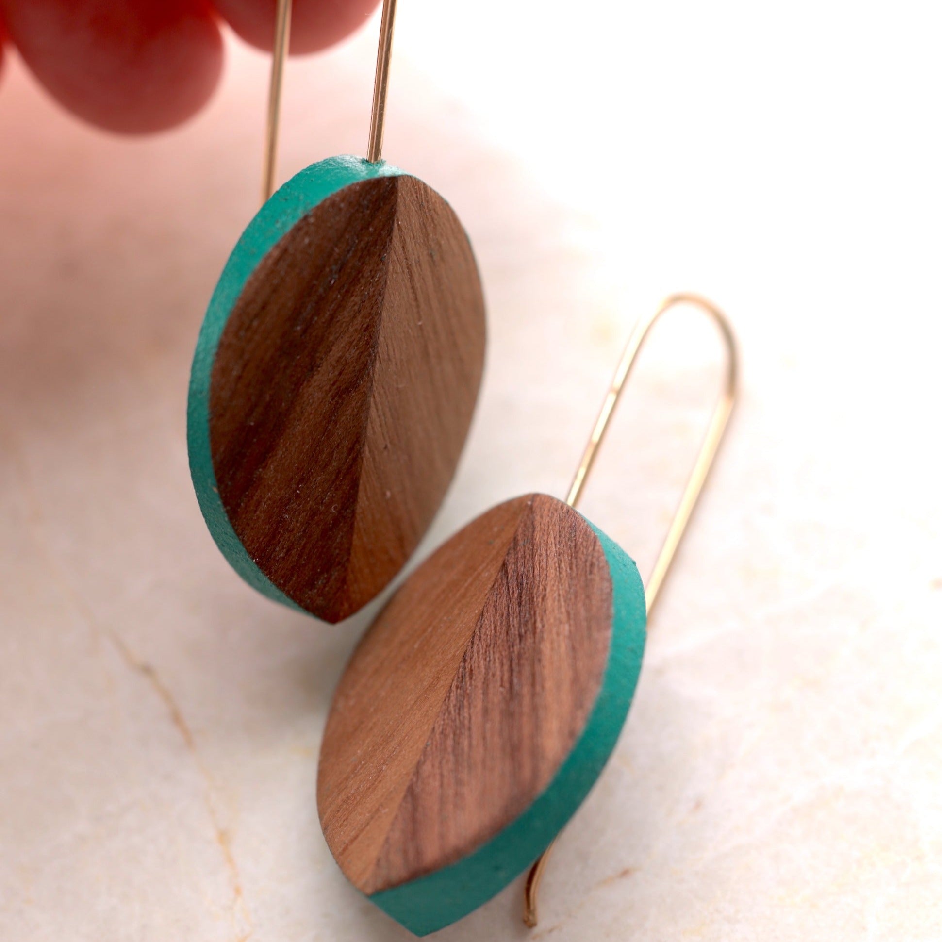 Sculpted perfection, works of art in and of themselves. Turn over a new leaf with these hand-cut wood earrings with turquoise painted accents. Available in light maple, or darker walnut. They'll no doubt complete that artfully crafted look of yours.