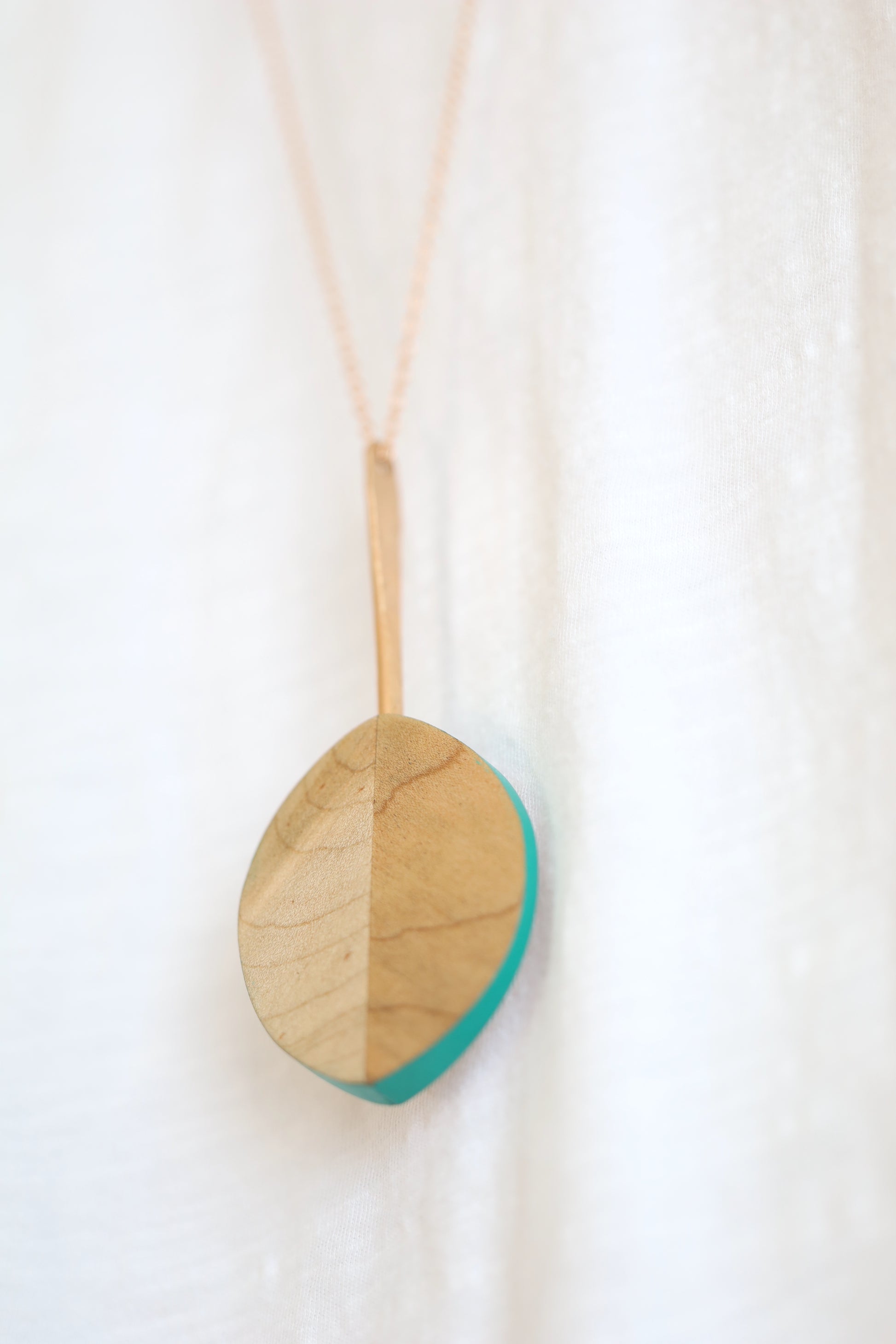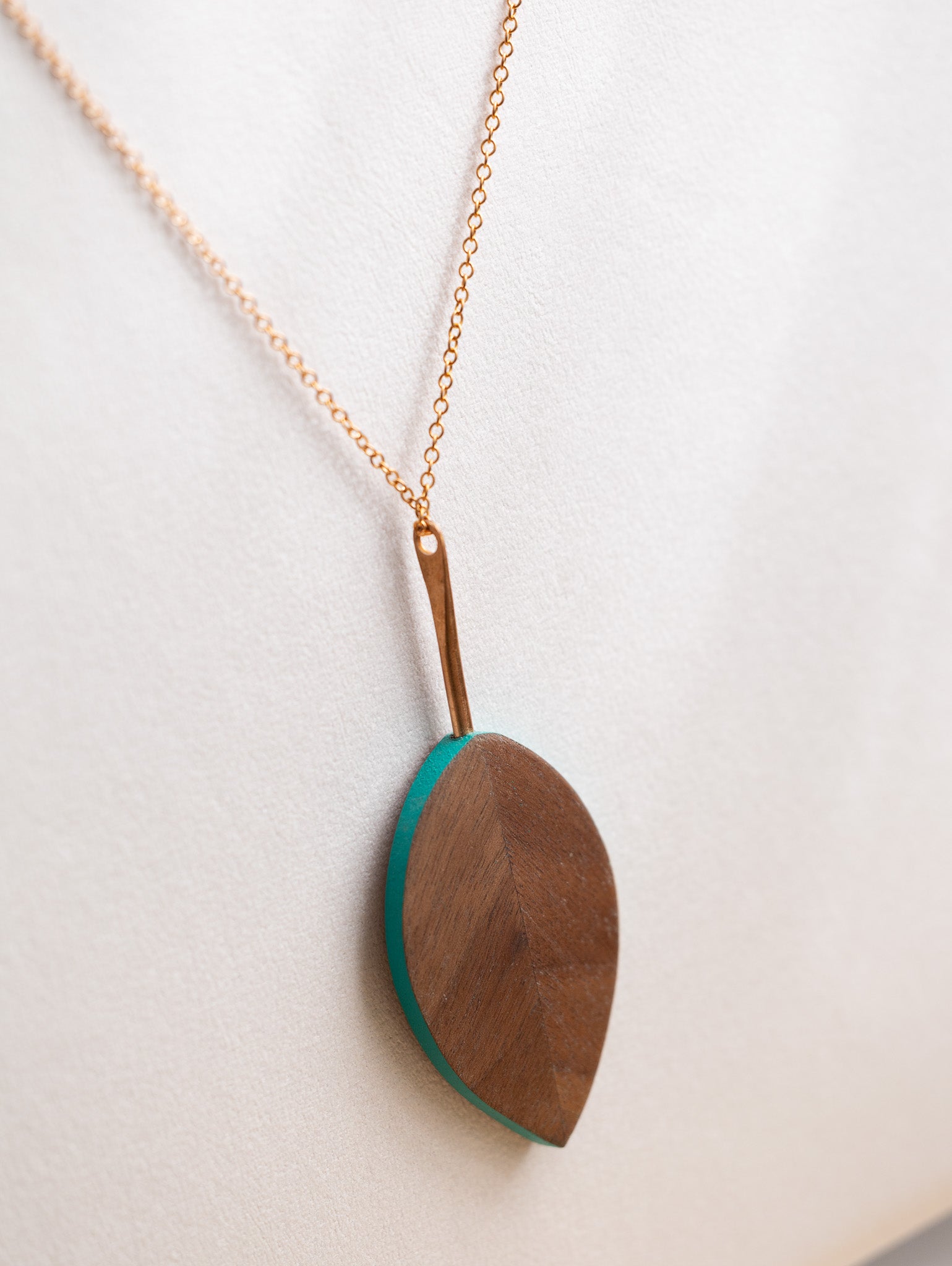 A symbol of the natural world, the leaf pendant comes to life via hand-cut maple (light) or walnut (dark) wood, beautifully sculpted, hand-painted with turquoise accents, and paired with a bronze stem. The lightweight pendant is hung from a 28'' bronze chain. This eye-catching necklace adds an element of fun to casual or dressy outfits and pairs perfectly with the New Leaf Earrings!