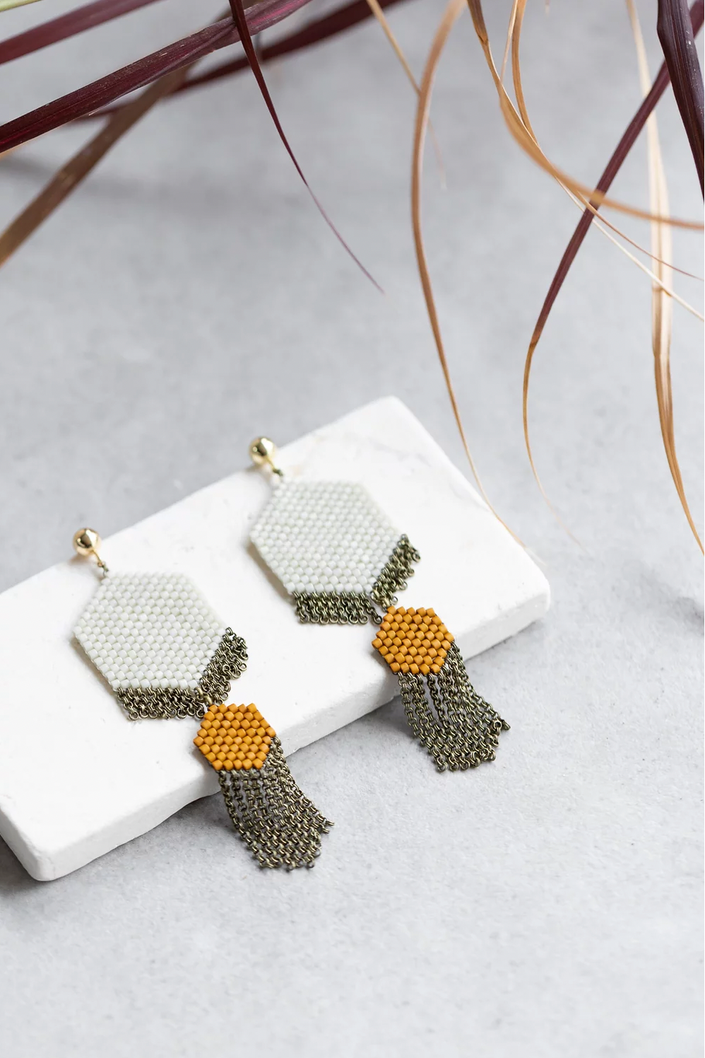 - Materials - Japanese Delica glass beads, antique brass chain, 4mm 14k gold fill ear studs and backs.
